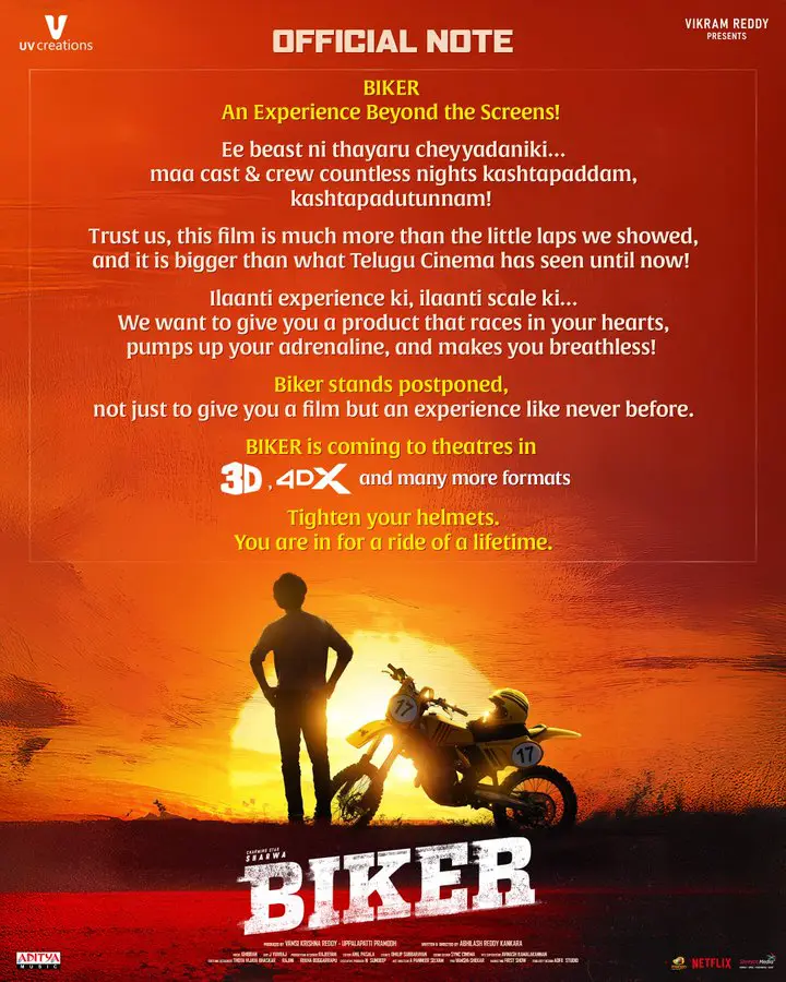 Presented by UV Creations and Vikram Reddy, Biker will be available on Netflix after its theatrical run. While the new release date is yet to be announced, the makers have asked fans to “tighten their helmets” and get ready for a ride of a lifetime.
