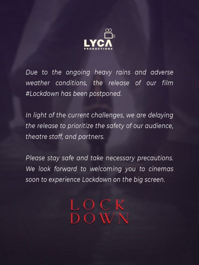 Originally planned for release tomorrow, the film Lockdown, starring Anupama Parameswaran, has been postponed because of severe rainfall in Chennai, and the filmmakers have yet to reveal a new release date.
