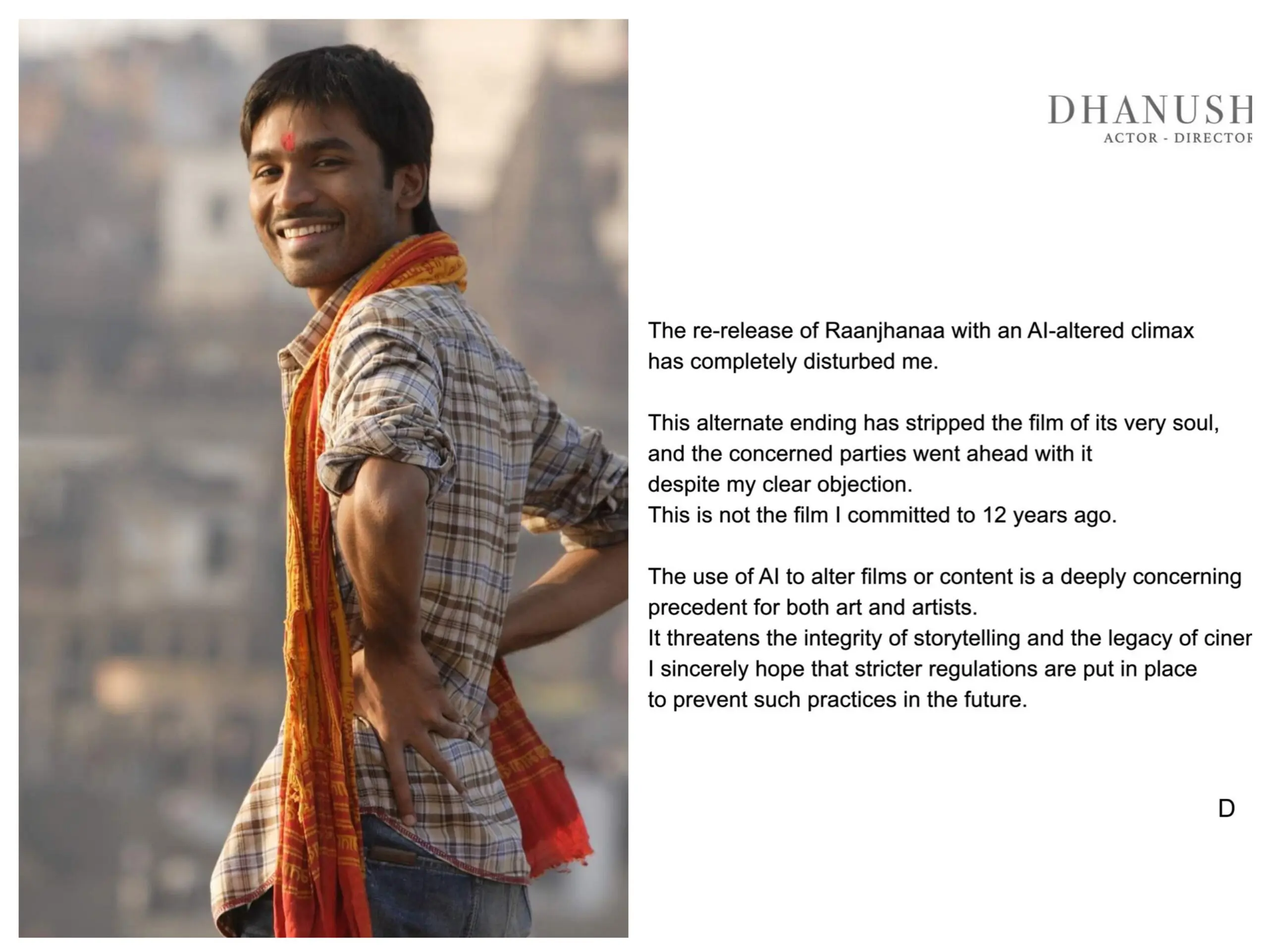 This modification altered the whole tone of the story, gaining conflicting emotions from spectators. While some viewers found the alteration more soothing or hopeful, others believed it reduced the film’s emotional touch and completely altered the soul of the story. Dhanush responded to the change of the movie’s climax with a powerful statement of disappointment. He stated that the new version was released despite his strong objections, saying, “This is not the film I committed to 12 years ago.” He added that altering the narrative detracts from its original essence and purity.