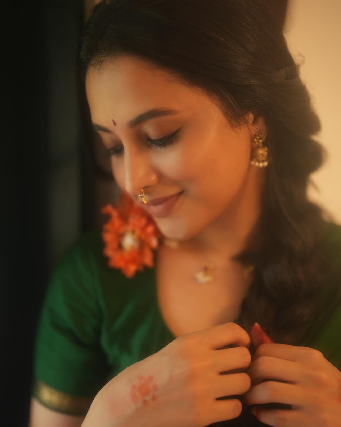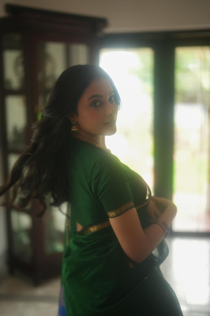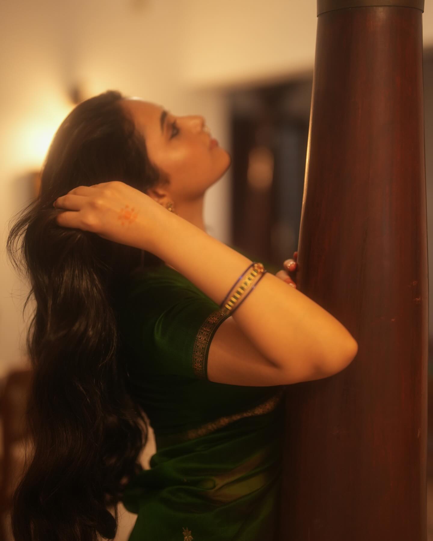 Priyanka Mohan radiates elegance in this stunning green saree. The actress looks absolutely beautiful in this traditional attire.