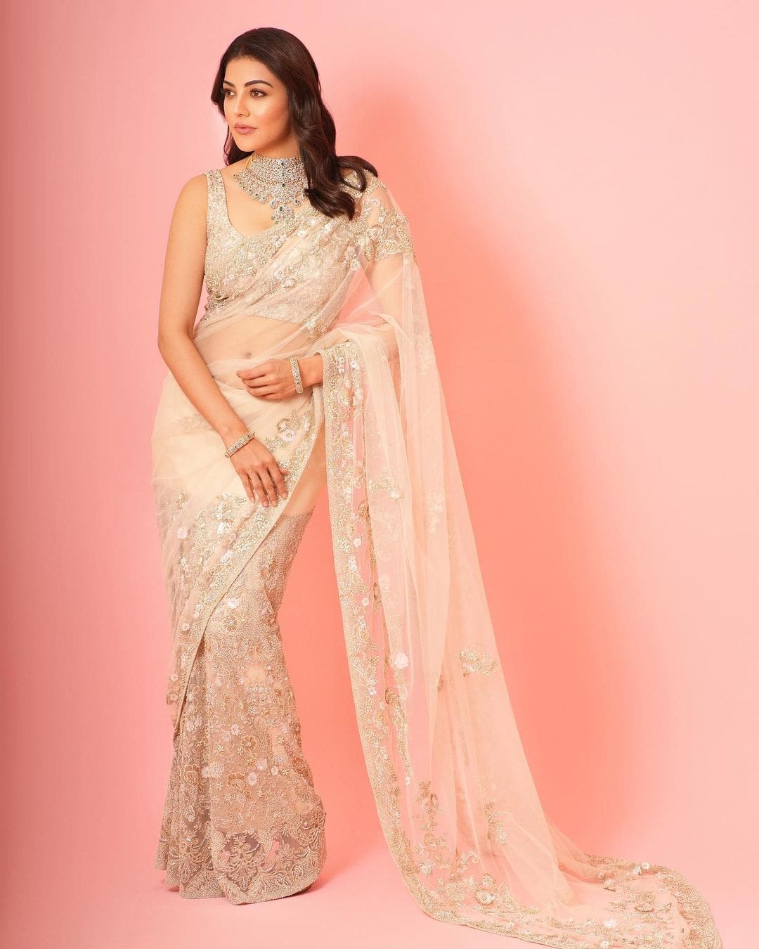 Kajal Aggarwal, adorned in a gorgeous saree, effortlessly turned heads with her stunning beauty. The traditional attire perfectly highlighted her radiant features, and the graceful ensemble added an extra layer of allure.