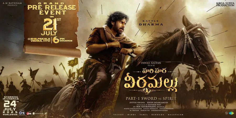 The grand pre-release event of Pawan Kalyan’s Hari Hara Veera Mallu will be held at the Shilpa Kala Vedika at 6 PM on July 21st. The makers announced this with a powerful poster.
