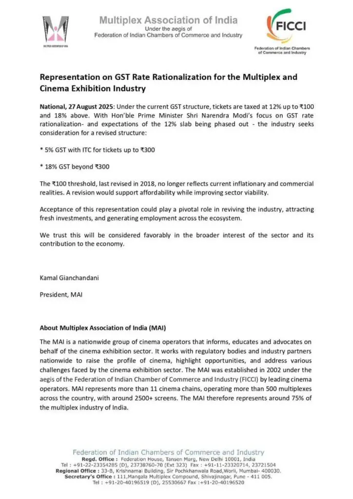 Right now, if a movie ticket costs more than Rs 100, it gets hit with an 18 percent tax, but tickets under Rs 100 only have a 12 percent GST. MAI suggests making some big changes to this threshold. Kamal Gianchandani, the MAI president, mentioned to the media that we suggest increasing the Rs 100 slab to Rs 300, meaning ticket prices up to Rs 300 should have a 5 percent GST, while anything over Rs 300 should face an 18 percent GST.
