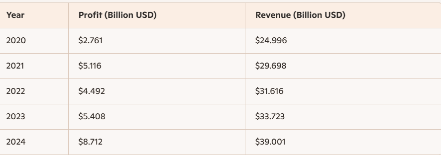 Over the past five years, Netflix’s revenue has steadily grown from $24.996 billion in 2020 to $39.001 billion in 2024. This consistent growth shows the platform’s strong global performance.