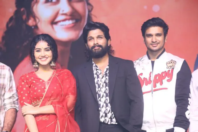 Sensational Hero Nikhil and Anupama Parameswaran will be seen sharing electrifying chemistry in the crazy love story 18 Pages directed by Palnati Surya Pratap. The film is carrying good buzz with interesting posters, songs and promotions. As the release date is getting nearer, yesterday makers arranged a grand pre release event. Icon Star Allu Arjun graced the pre-release event and Director Sukumar also attended the event.