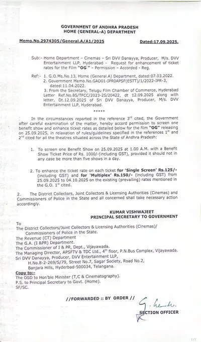 Andhra Pradesh Ticket Hike G.O. for OG Movie