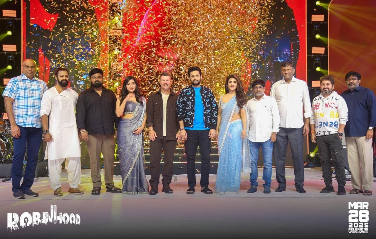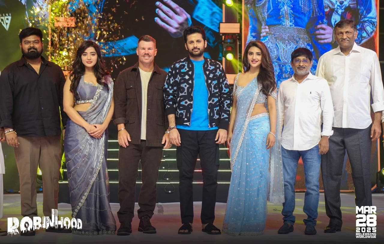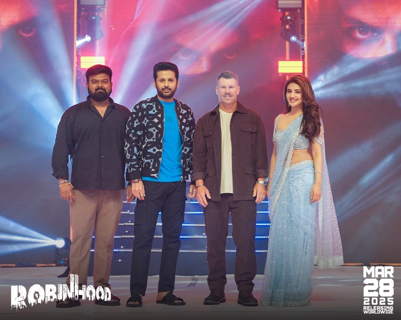 Robinhood Movie, directed by Venky Kudumula is set to hit big screens on March 28th. The film had a grand pre-release event today in Hyderabad. Film’s cast Nithin, Sreeleela and various other actors graced the event. David Warner attended the event as a special guest. He also played a small role in the film.