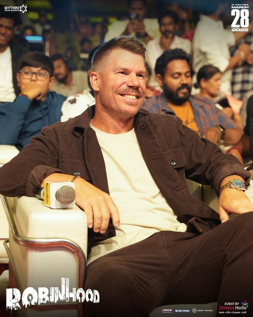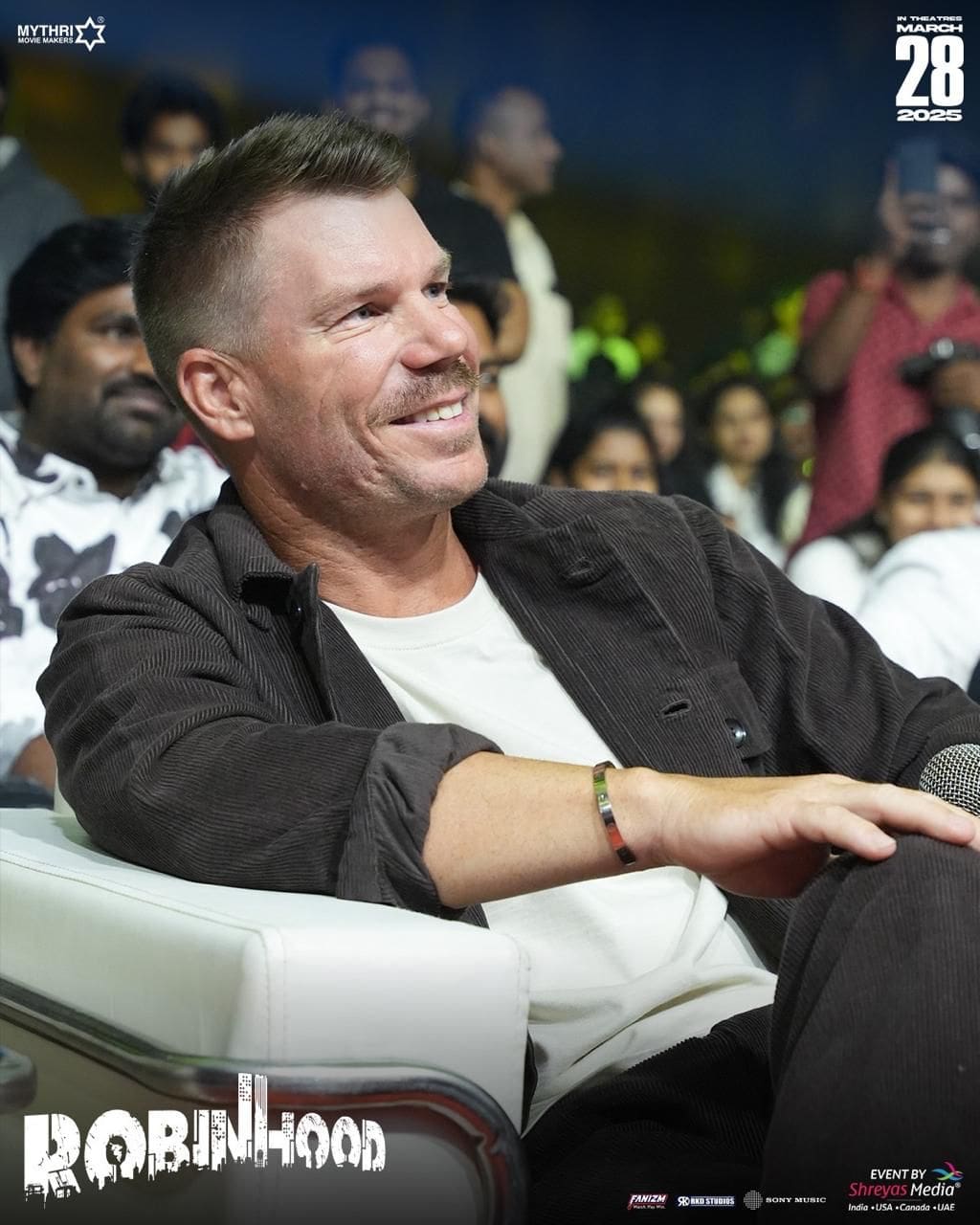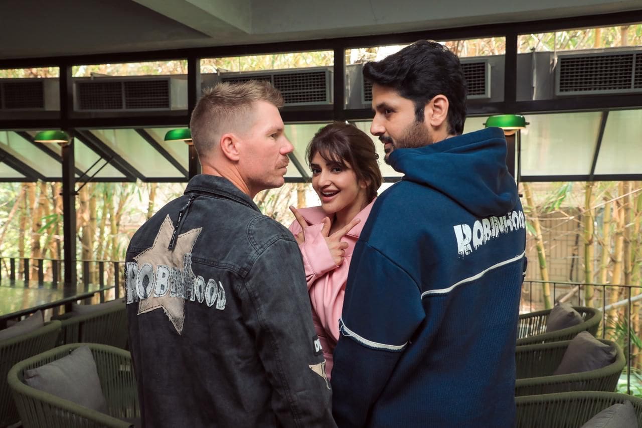 Robinhood Movie, directed by Venky Kudumula is set to hit big screens on March 28th. The film had a grand pre-release event today in Hyderabad. Film’s cast Nithin, Sreeleela and various other actors graced the event. David Warner attended the event as a special guest. He also played a small role in the film.