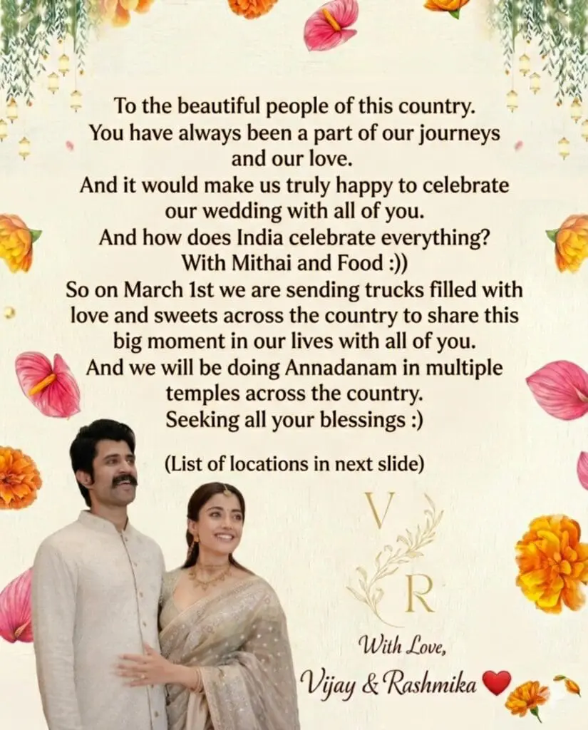 From social media trends to heartfelt fan messages, the happiness surrounding their wedding is truly overwhelming. Now, taking that love a step further, Vijay and Rashmika have decided to celebrate their special moment not just with family and friends, but with the entire nation.